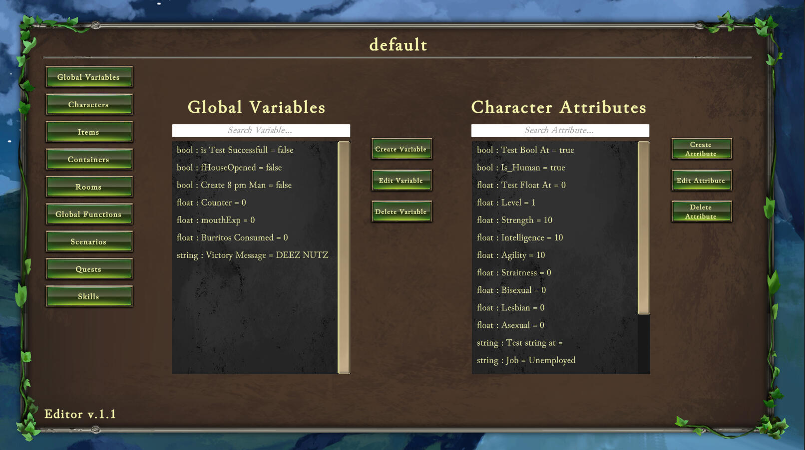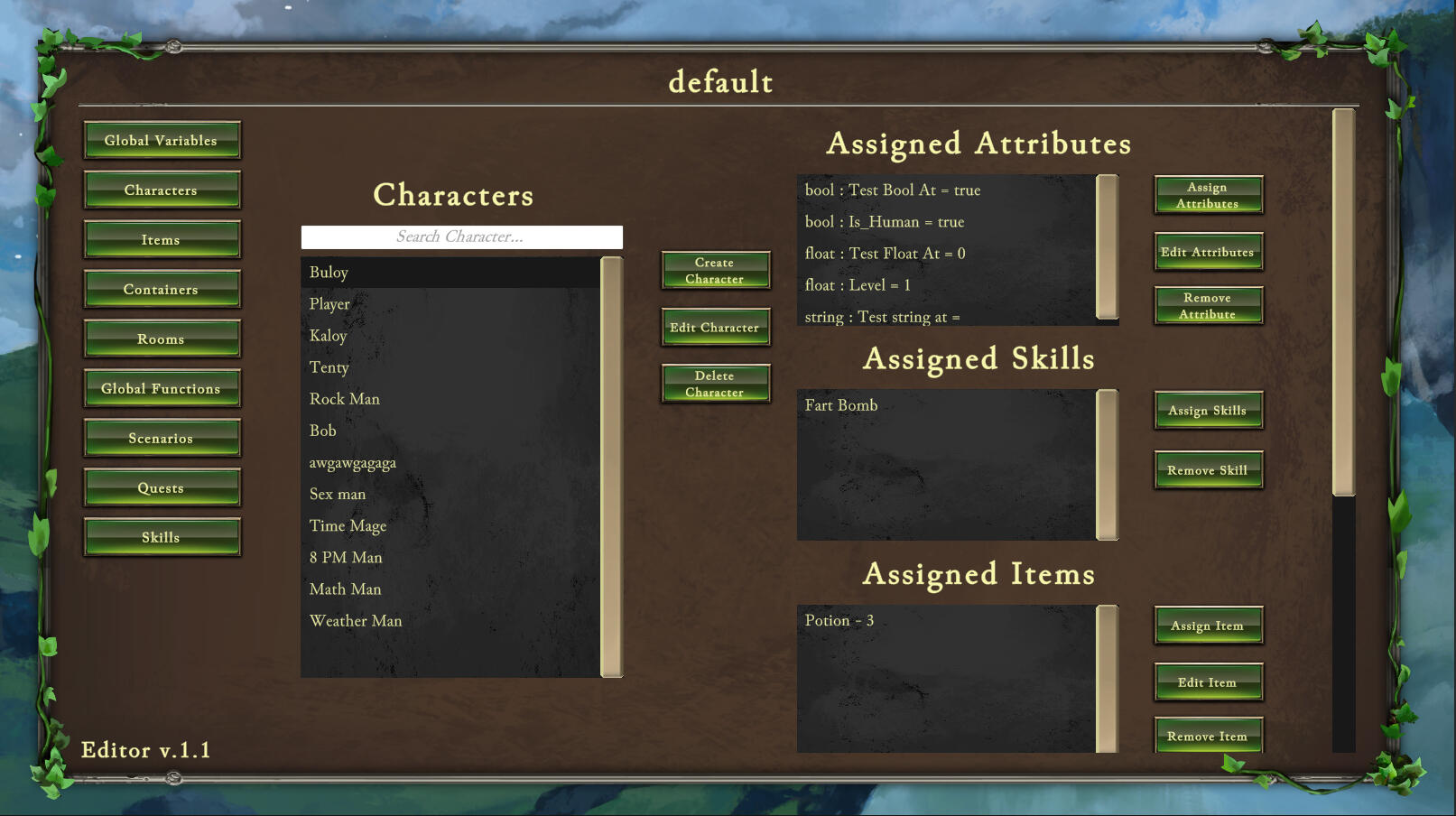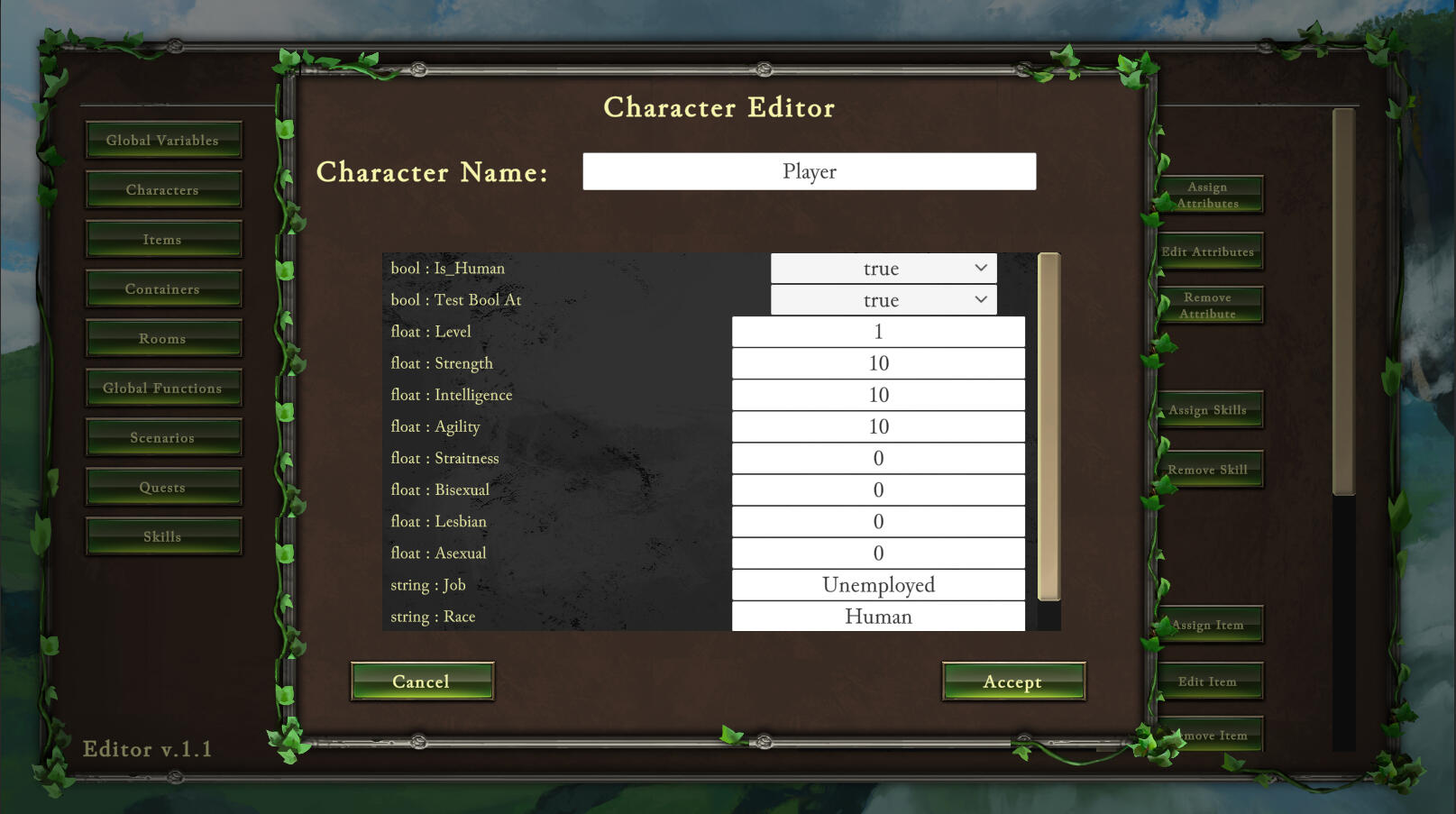 Object Entities - Characters, Items, Containers, & Rooms with custom attribute editor and assignments.