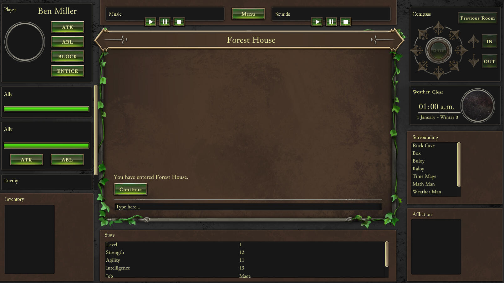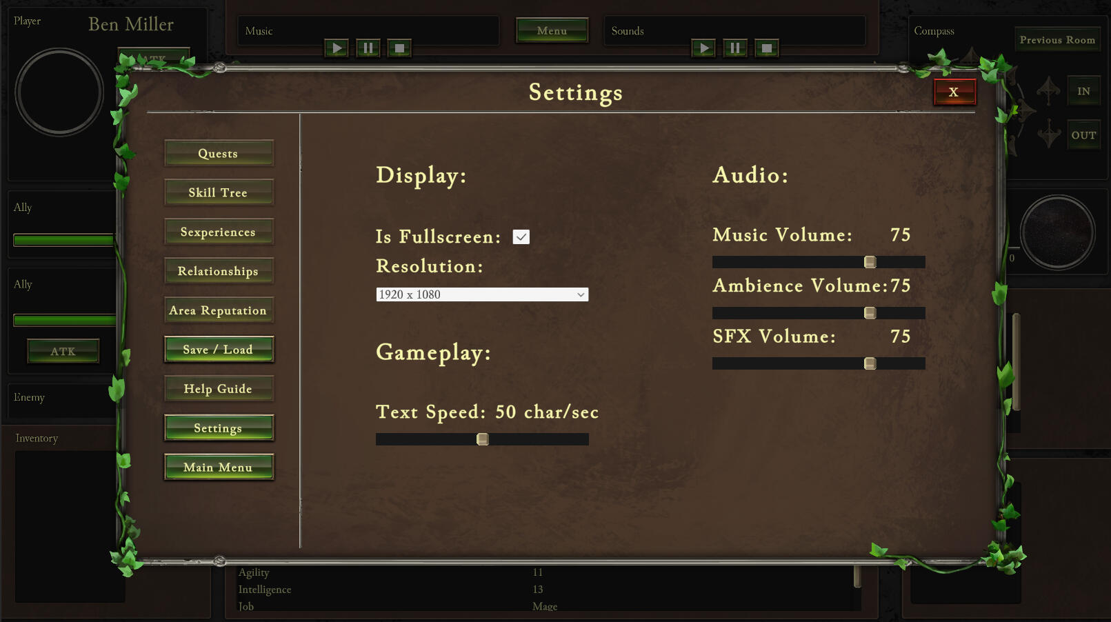 Character, Party, Battle, Inventory, World Navigation, Dynamic Time and Weather, Surroundings, Afflictions, Stats and Music Player Systems for the Main Game Mode.
